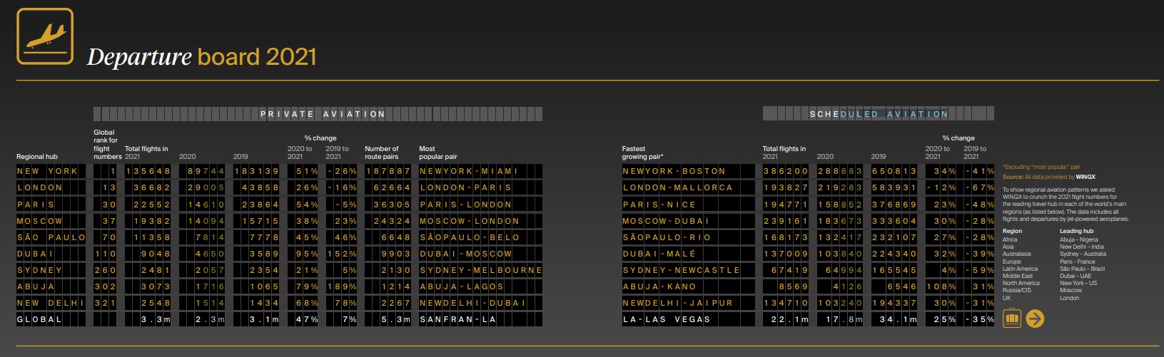 Elsewhere, South America saw a pronounced increase in the use of business aviation aircraft, with on-demand services filling gaps in cratered airline networks. São Paulo was the key regional hub, with business jet flights up nearly 50% on 2019.